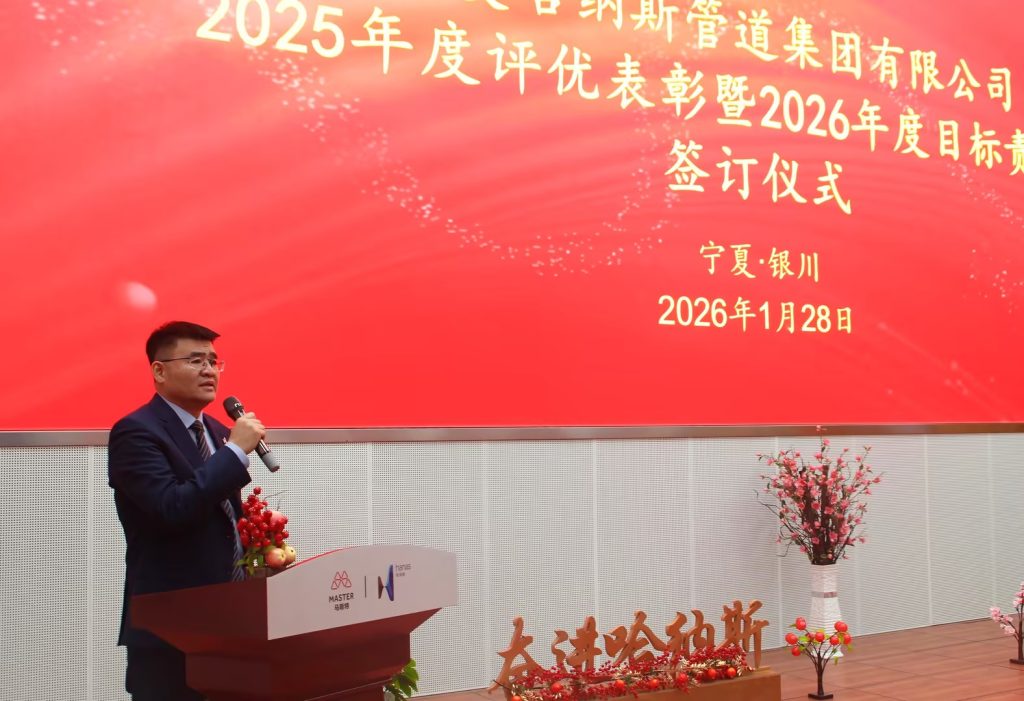 最后,哈纳斯集团副董事长、管道集团董事长王少波先生作总结讲话,他充分肯定了管道集团2025年取得的工作成果,对全体员工的努力付出表示认可和感谢。他强调,2026年全体员工要以目标责任书为抓手,在马斯特集团、哈纳斯集团的统筹引领下,秉持团结奋进、锐意进取的工作作风,凝心聚力、履职尽责,全力推动年度各项任务落地,助力集团整体经营目标的达成。